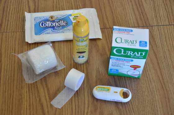 The first aid supplies could be stored in half-height zip-lock baggies. The bags protect your supplies against moisture and vibration wear-and-tear.